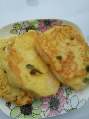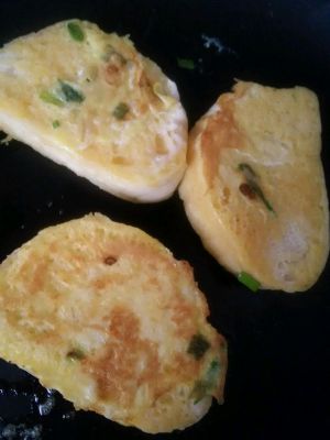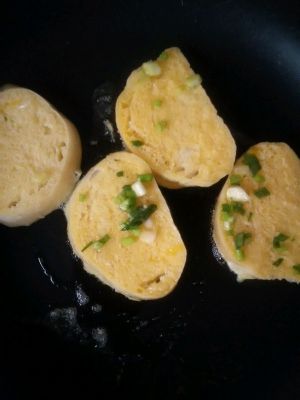 黄油化开后,将馒头片蘸满葱花鸡蛋液依次放入平底锅中火煎!