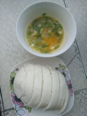 鸡蛋打散,加少许盐搅拌。葱洗净切末,放入鸡蛋液中。馒头切片!