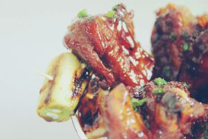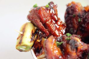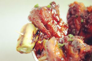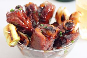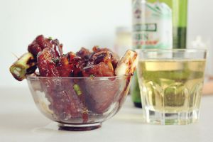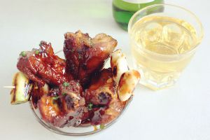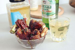 小火等收汁,期间烤了葱段和蒜瓣,等着用红烧排骨收的汁淋上一起吃,成品如图,楼主倒了一杯啤酒,生无可恋的吃了起来