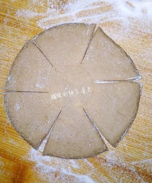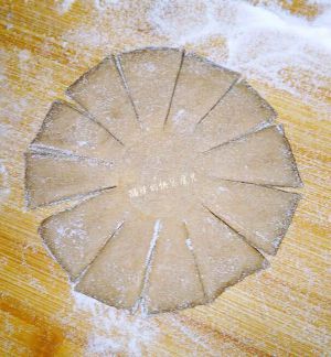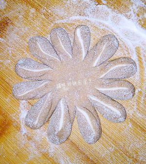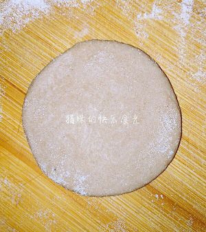 再次用擀面棒擀成圆皮后,取一个瓶盖,在面团中心位置扣下去。