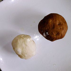 充分的排气后,将面团分成60%、40%的2个面团,60%的面团加入可可粉揉均匀,40%的面团保留本色。 将可可面团分成20克1个的小面团,白色面团分成15克1个的小面团。 盖上保鲜膜松弛15-20分钟。