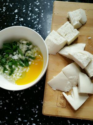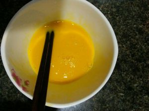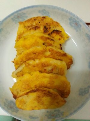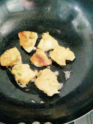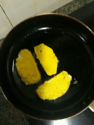锅里倒入油,把粘好蛋液的馒头片放下。