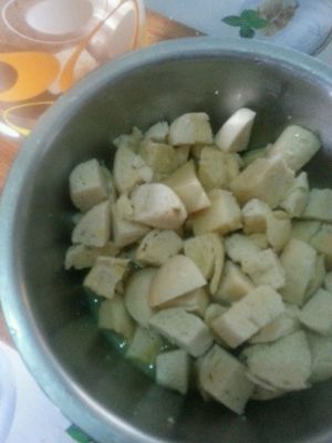 地瓜蒸软,同时用20克温水把3克酵母化开静置旁边。