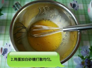 2.鸡蛋加入白砂糖打撒搅拌均匀。