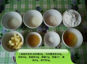 准备食材。 普通面粉:500g、酵母:4g、无铝泡打粉:1g