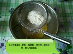 2.红薯淀粉(马铃薯淀粉都可以),奶粉,低筋粉,泡打粉,混合过筛,加入搅拌好的鸡蛋液里。