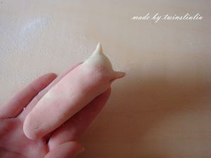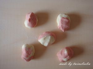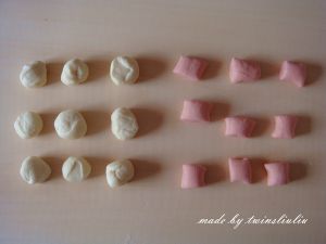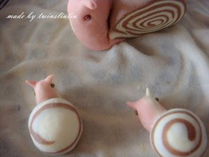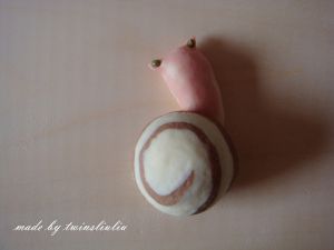 分别取白色、粉色两种颜色的小面团来做蜗牛的脖子。大小请与蜗牛壳大小比例做好对应。