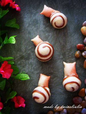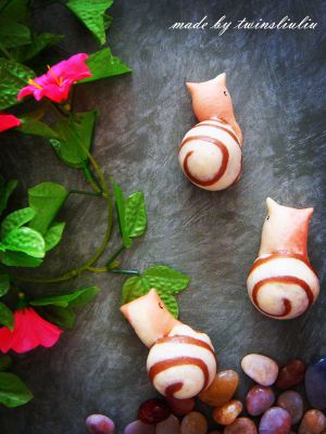 将蜗牛的脖子的另一端压扁,将蜗牛壳放在上面。可以用绿豆做成蜗牛的眼睛。第一种款式的蜗牛就做好了。
