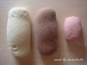 将酵母、泡打粉混入面粉中,搅拌均匀。分别和出原色、咖色(可可粉)、粉色(红曲粉)三色面团,其中原色与咖色面团的大小基本相等,粉色略小。将三色面团放在不同的容器中盖上湿润的屉布,温暖处分别发酵。