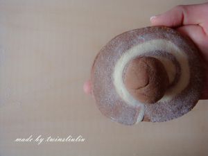 待面团发酵至原来的1.5至2倍大时开始制作。取适量咖色面团,擀成长方形面片,薄厚适中。