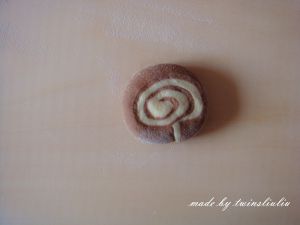 接下来,我们再来做另一种款式的蜗牛。将步骤8中切好的剂子螺旋花纹向上压扁。