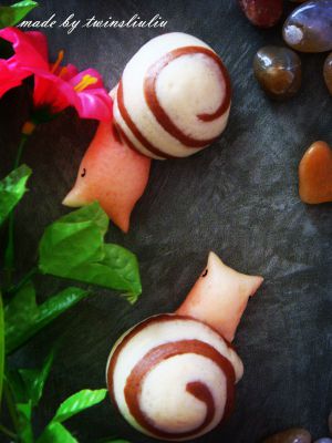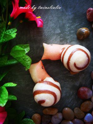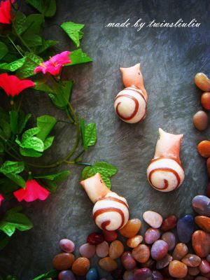 做好蜗牛的脖子,放在蜗牛壳下面,用绿豆做眼睛,另一种款式的蜗牛也做好了。
