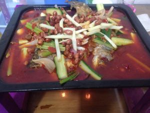 因为做的时候没有拍照,口述步骤! 1.鲈鱼洗净晾干 2.油锅放1000克油,油温8成热,放入鲈鱼炸到2面金黄,放入烤盘! 3.锅里留200克左右油,放入花椒,等花椒糊后捞起,放入辣椒、生姜、葱段、郫县豆瓣酱熬出红油,放入素菜黄瓜、芹菜、煎好的花生等,倒入水,放上盐和鸡精,等水开,倒入烤盘,点上蜡烛,来吃