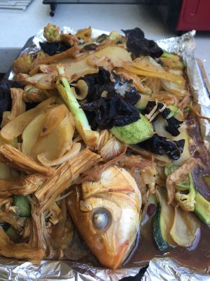 烤箱预热10分钟,烤盘放锡纸,涮一层油,放上鱼烤20分钟,这中间可以炒配菜,炒7分钟熟