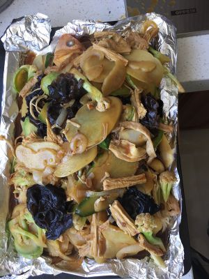 鱼放入烤箱210度烤20分钟拿出来,放上炒好的配菜再放回烤箱