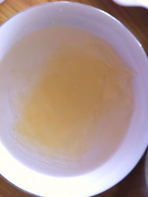 用冰水泡好的吉利丁片放在小碗中,隔热水融化,慢慢倒入搅好的蛋黄糊中。倒吉利丁前,蛋黄糊要再搅一下,以免静置产生沉淀。