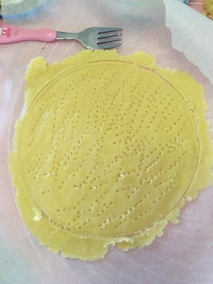 把黄油软化。面。糖。蜂蜜。鸡蛋。小苏打 混合成面团 然后擀成薄饼。扎孔。分出8小份面团。预热烤箱