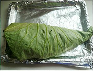再将酱油一勺、黄酒两勺和香叶、葱段、姜片混合后 倒在鱼的身上 用荷叶将鱼和调料一起包好