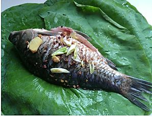 鱼放在荷叶上 将步骤2的调料均匀的抹在鲫鱼两面和鱼腹内 腌渍片刻 烤箱预热200°