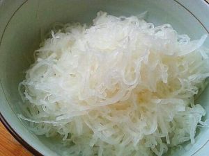 萝卜去皮刨成丝,用开水烫一下后加入盐腌制2、3分钟,沥干.撒上葱花