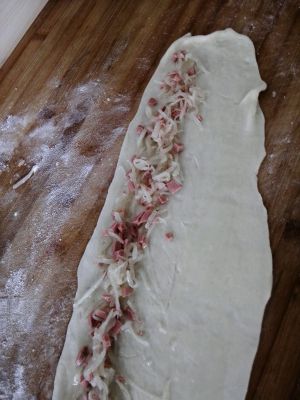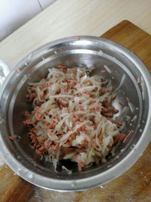 醒面的时间做馅料,萝卜洗净去皮檫丝,锅里放水烧开放萝卜丝焯水两到三分钟,捞出来过凉水,控干水分备用,火腿切碎,葱切碎,把萝卜丝,火腿,葱放在一个盆里,放香油,黑胡椒,盐搅拌均匀备用