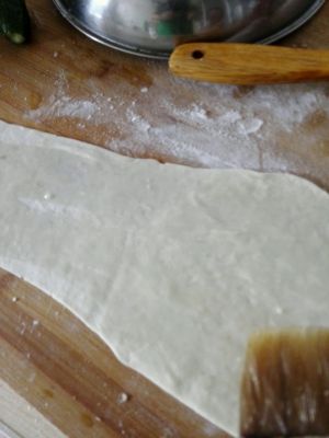 醒好的面团分别分成均匀的小剂子,去一个小面团擀长条,稍微宽点,刷上油