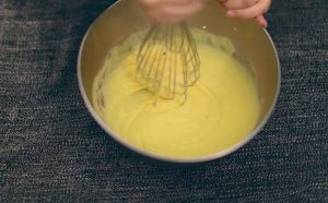 在牛奶里倒入鸡蛋,并且用打蛋器搅拌均匀,就是布丁液了。