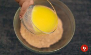 将碾好的饼干碎倒入玻璃碗中,再倒入事先融化好的黄油。