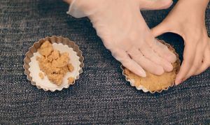 将搅拌好的消化饼干放入挞模,并用手压平。