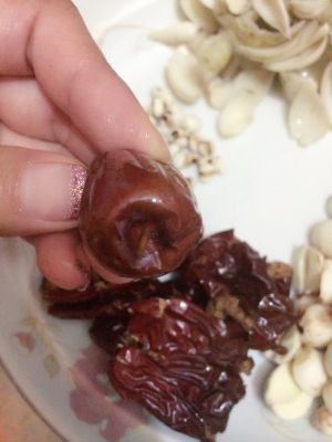 红枣去掉枣瓣儿和枣核儿。枣瓣儿留着也会发苦。