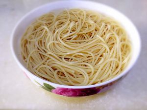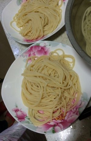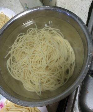 将意大利面沸水煮熟(意大利面比较不易煮熟,所以需多煮一会儿),将煮熟了的意大利面迅速捞出,放入冷水中浸泡(放冷水中浸泡一方面是为了意大利面吃起来更加筋道儿,另一方面是为了面条不易粘在一起)