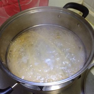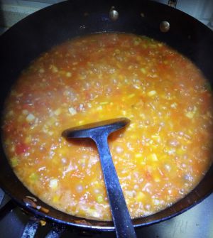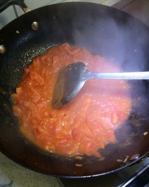肉馅倒入番茄酱汁里,继续翻炒,加入一大碗开水,一小勺番茄酱,大火一直煮至软烂!(可以用高压锅,时间自己掌握)