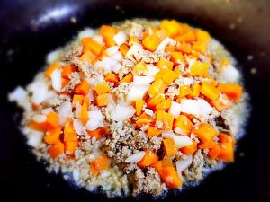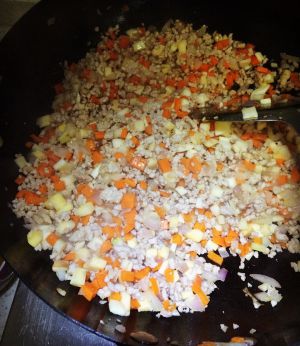 锅里加入2/3黄油,放入猪肉末,炒至发白,继续炒5分钟,加入杏鲍菇,胡萝卜,洋葱,继续翻炒,炒至入味,全部炒熟,掺入盘中!