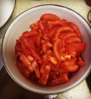 所有主材切成小颗粒,便于能裹在意大利面上面,口感更棒,西红柿一定去皮!