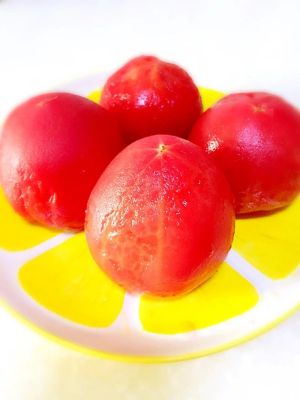 将4个番茄放入沸水中烫1~2分钟,然后轻轻剥掉番茄的外皮(番茄放入热水中烫一下易去皮)
