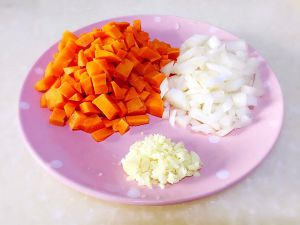 将胡萝卜、洋葱、蒜瓣洗净去皮,然后将胡萝卜和洋葱切块儿,蒜切末