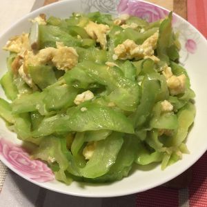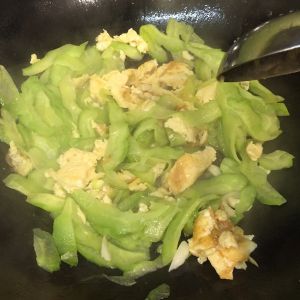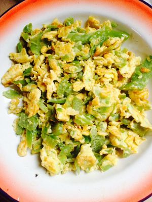 少许油热锅,蒜末煸香,先放辣椒,然后倒入苦瓜。大火迅速煸炒。颜色变绿,放入鸡蛋。均匀混合,加鸡精和盐。