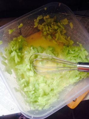 锅热后,放入一点点油!不要多!然后倒入苦瓜蛋液均匀摊平,小火翻炒,快熟时加点蚝油和一点盐,然后出锅