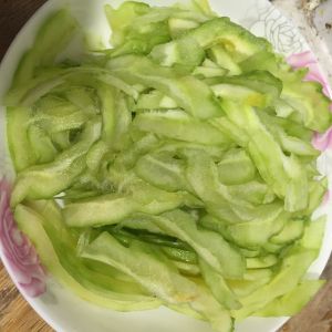 苦瓜洗净,从表面刨,留下苦囊,刨下来苦瓜的切碎