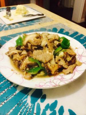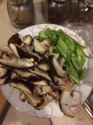 锅内留油加入香菇翻炒变软,加入青椒和炒好的肉片,入盐和蚝油调味,出锅