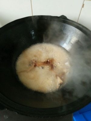 起锅倒入3分之1可乐 最好是百事 放入排骨 八角生抽