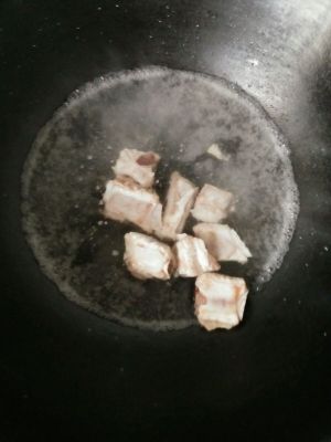 排骨放入冷水10分钟去血,锅里把水烧开,放入排骨,等到锅面上出现油脂,捞出排骨,用冷水洗净,再装盆,倒入料酒,生抽,盐,腌制20分钟