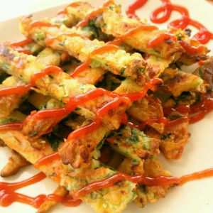 将煎好的饼 切成条摆盘 淋上番茄沙司