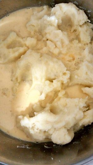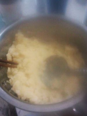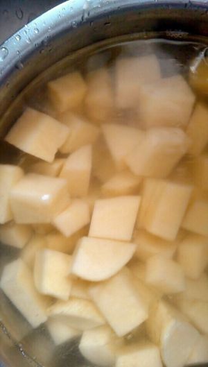 蒸熟后用勺子背面把土豆块捣成泥,然后冷却至常温