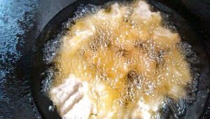 这是经历过三滚的半成品,我们准备油锅,中温的时候放进去,注意油温不要太高,要一面一面的炸,一年金黄后再炸另一面,不要反复翻个,要不然容易散,因为本身都是熟的,油炸时间不用太长