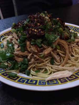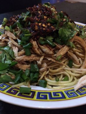 取盘子,夹一人份的凉面,上面放适量的鸡丝,放姜蒜末,葱花,香菜末,盐,鸡精,酱油,醋,一点白糖,花椒油,辣椒油(不喜欢姜蒜的朋友可以不放)。
