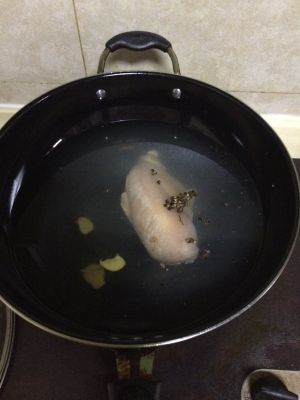 鸡胸一块,分成几小块,盆中加适量水,生姜片,大葱适量,加两勺盐,加几颗花椒,两颗八角,大火煮15分钟