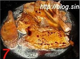 把鸭子翻面,继续煎至金黄,把油分煎出;
