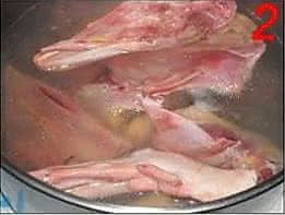 生姜切片后,一半放水里煮,放进斩成3大件的鸭子,倒入1汤匙的料酒煮至水开;(这个办法去臊味很好)