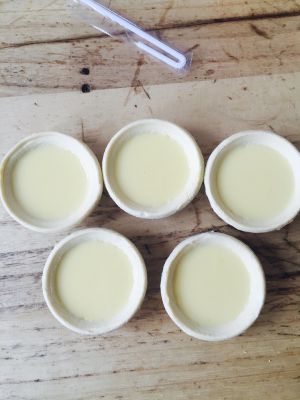 将蛋挞液均匀倒入蛋挞皮中至9分满。